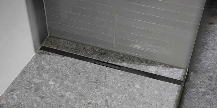 Erhältlich in gebürstetem Edelstahl sowie in Schwarz, wie hier abgebildet, bietet die neue Geberit CleanLine30 Duschrinne vielseitige Gestaltungsmöglichkeiten für unterschiedliche Badstile.
